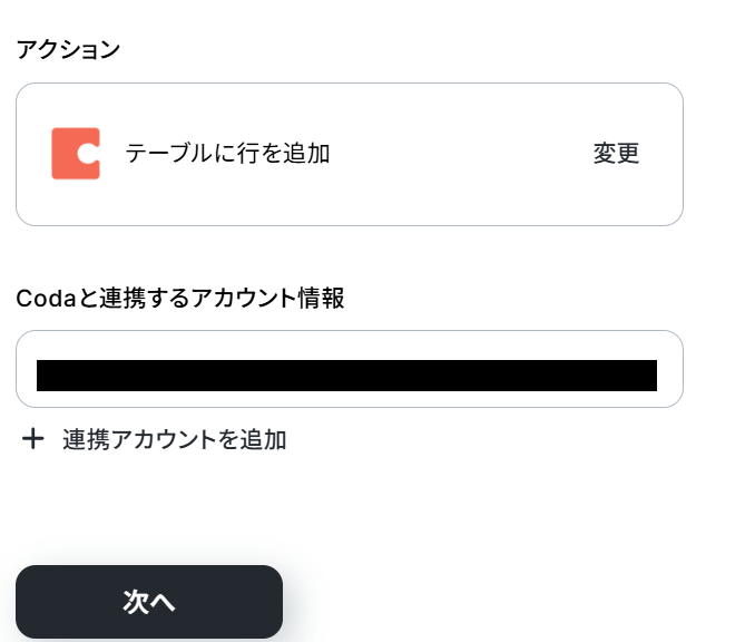 Codaと連携するアカウント情報を確認し、次のページへ進みましょう。