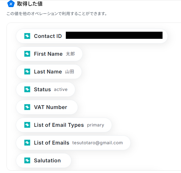 これらの値は、後続のオペレーション設定時に項目の値として使用することができ、フローボットが起動するたびに取得された最新の値として自動的に反映されます。