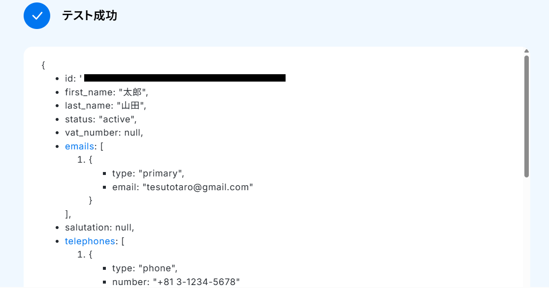 テストが正常に完了すると、取得した値が画面に表示されます。