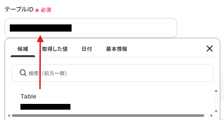 ドキュメントIDとテーブルIDは、枠内をクリックし表示される候補から選択してください。