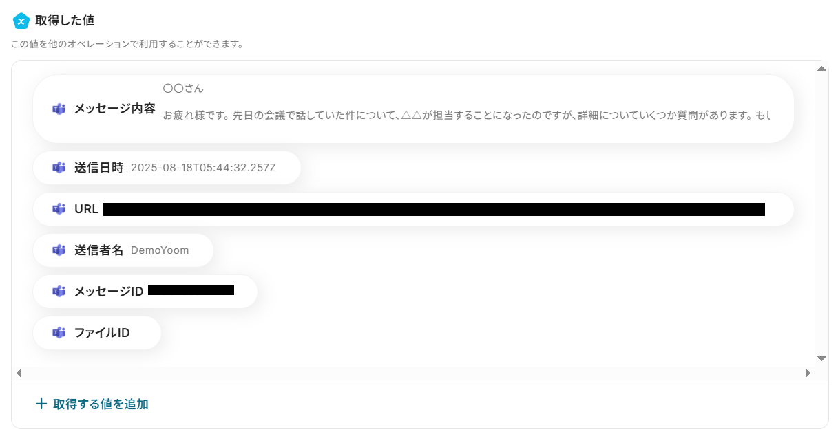 テストに成功するとテスト成功画面が表示され、以下のように取得した値(アウトプット)が表示されます。 取得した値はこのあとの設定でも使用します。 取得した値について詳しく知りたい方は、以下のリンク先をご覧ください。