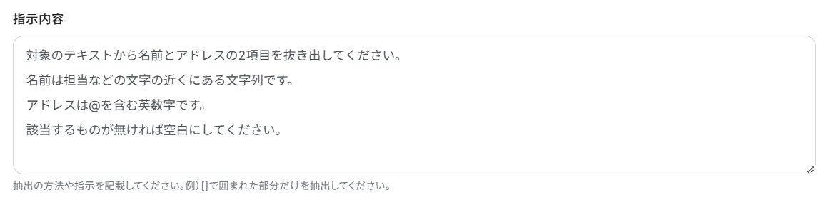 指示内容を設定します。 抽出はAIが行います。 AIに抽出したい項目の箇所が伝わるように指示内容を記入してください。 今回は下記のように入力しました。