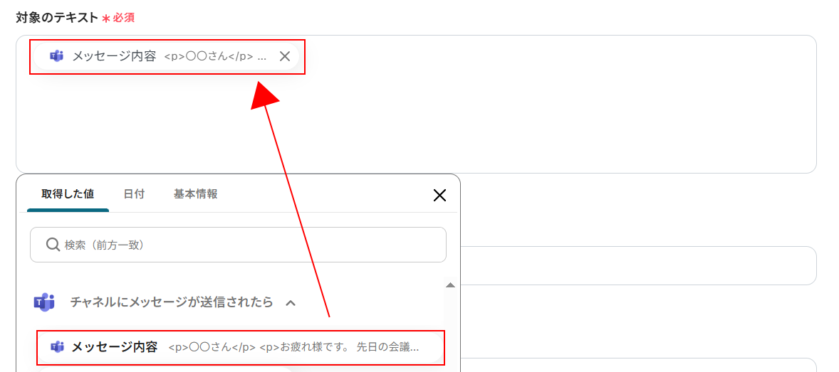 次に、対象のテキストを設定します。 対象のテキストはデフォルトで取得した値から設定されています。 下記のように入力欄をクリックして、選択することも可能です。