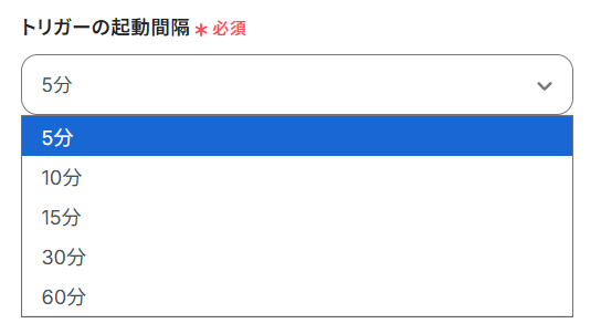トリガーの起動タイミングは、5分、10分、15分、30分、60分のいずれかで設定できます。 ご利用プラン によって、設定できるトリガーの最短間隔が違うので、その点は要チェックです。 なお、基本的にはそのプランの最短の起動間隔にしてお使いいただくことをおすすめします。