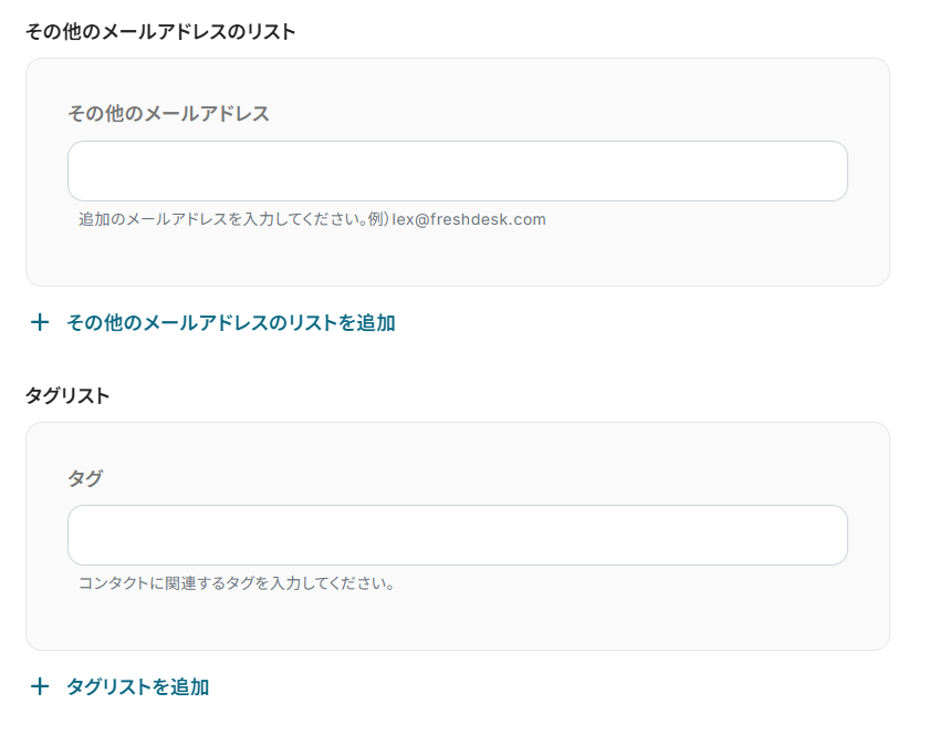 その他のメールアドレス、タグを設定します。 取得した値からの設定や直接入力での設定が可能ですが、先ほどと同様に設定したものは全てのチケットに反映されますのでご注意ください。 使用しない場合は空欄でも問題ありません。