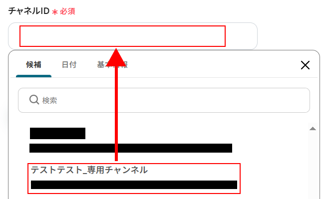チャネルIDを設定します。 コンタクト作成したい旨のメッセージを送信するチャネルを選びます。 こちらも入力欄をクリックすると候補が表示されますので、使用したいものを選択してください。