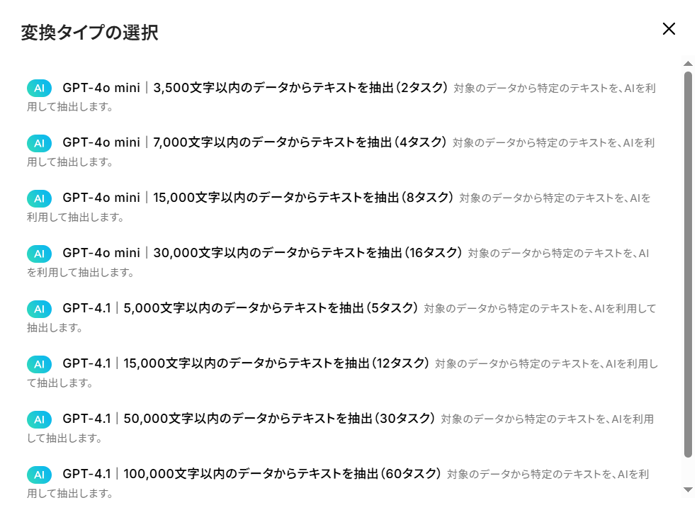 なお、変換タイプは「変更する」をクリックし、以下の中から選択することも可能です。 メッセージとして送りたい文字数や消費するタスク実行数を確認し、使用したいものを選んでください。 タスク実行数について知りたい方は、以下のリンク先をご覧ください。