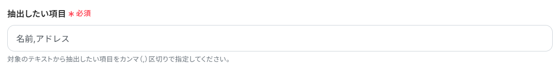 抽出したい項目を設定します。 今回メッセージから抽出したいのは「名前」「アドレス」のみですので、このまま使用します。 例えば、役職や住所などがメッセージに含まれており追加で抽出したい場合は、注釈にあるように名前とアドレスの後ろに「,役職,住所」のようにカンマ区切りで追加します。