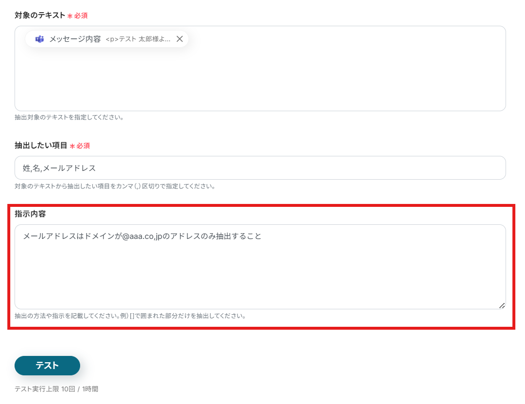 A:正確に精度を指し示す指標の提示は難しいですが、画像の赤枠箇所でAIに詳細な指示を記載することもできるため、テストを重ねて上手く特定の項目が抽出できるように調整を行うことも可能です。