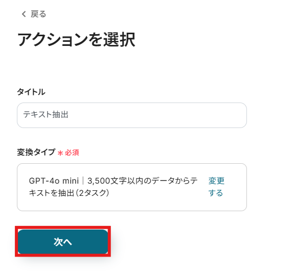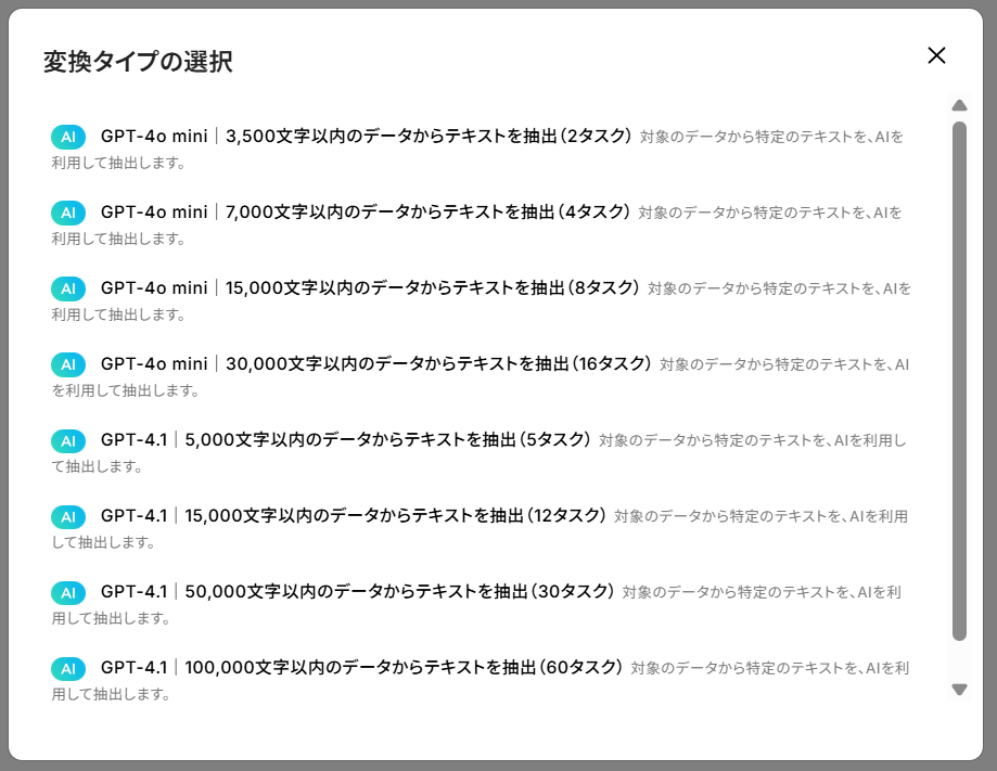アクションを選択画面では、抽出に使用するAIのモデルを選択できます。