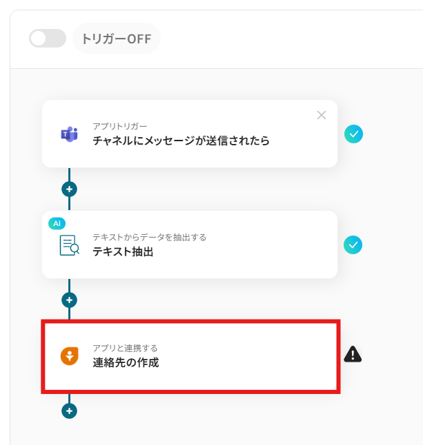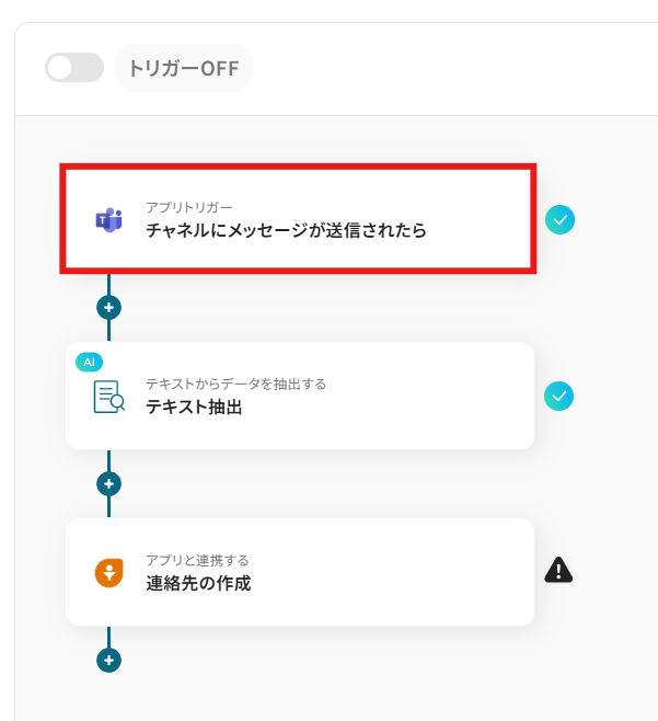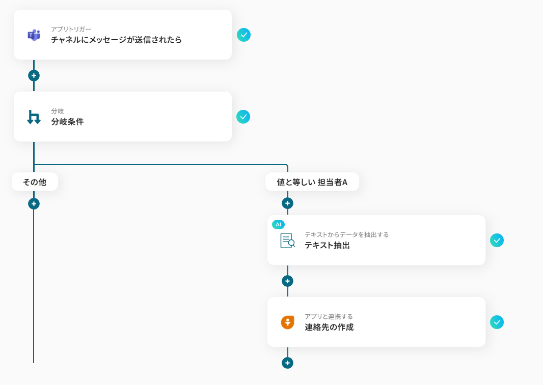 例えば下記のようにメッセージが担当者Aから送信されたときのみ、連絡先を作成するフローが作成できます。