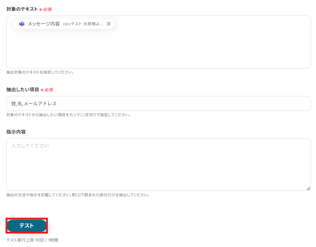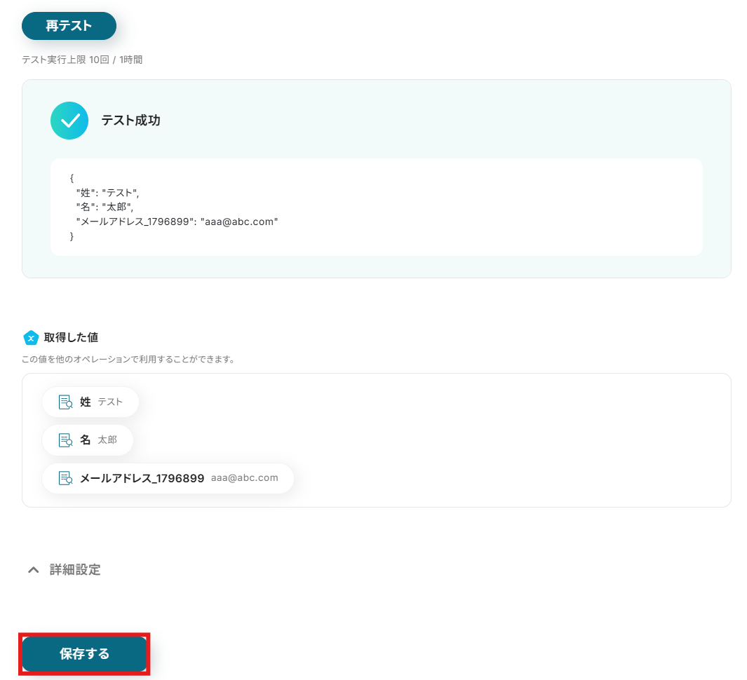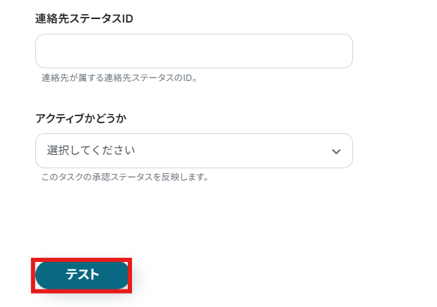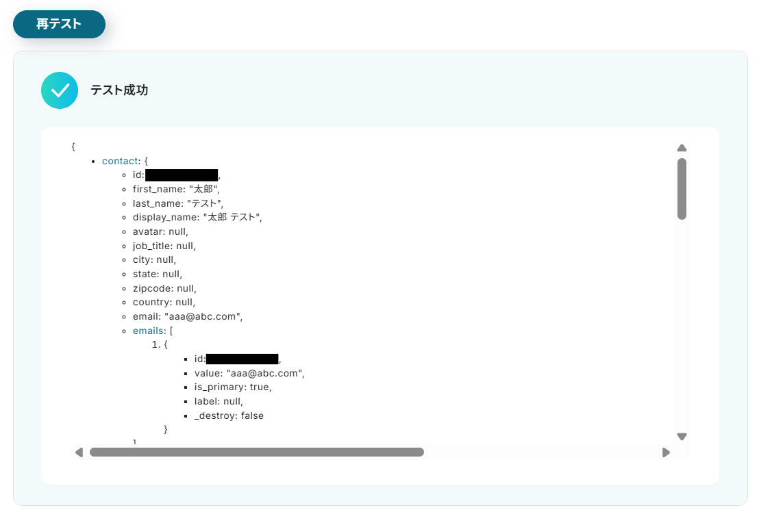 設定が完了したらテストボタンをクリックしましょう。(※実際にFreshsalesに連絡先が作成されます。)