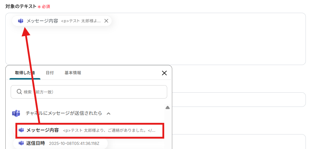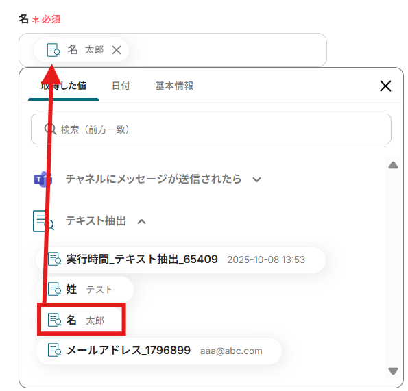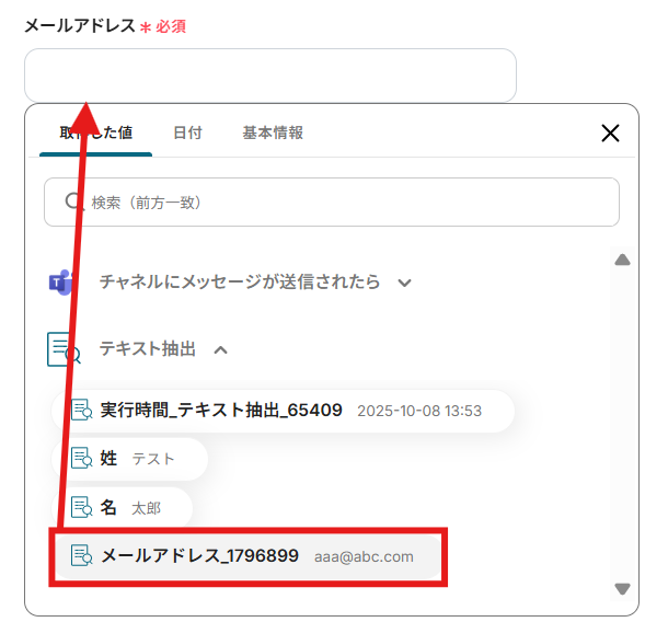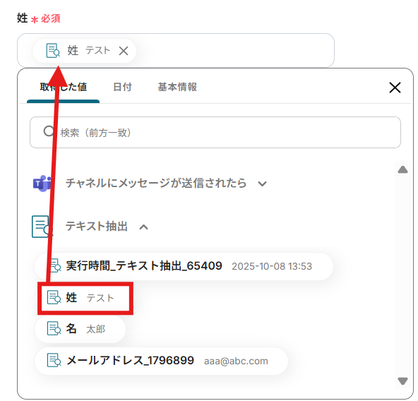 トリガーやオペレーション設定時に、「テスト」を実行して取得した値のことを指します。