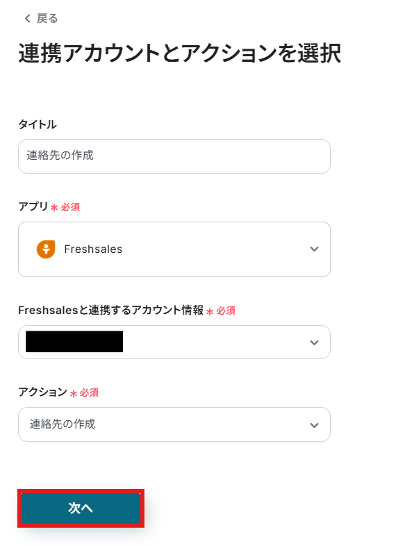 「連携アカウントとアクションを選択」画面では以下を設定します。