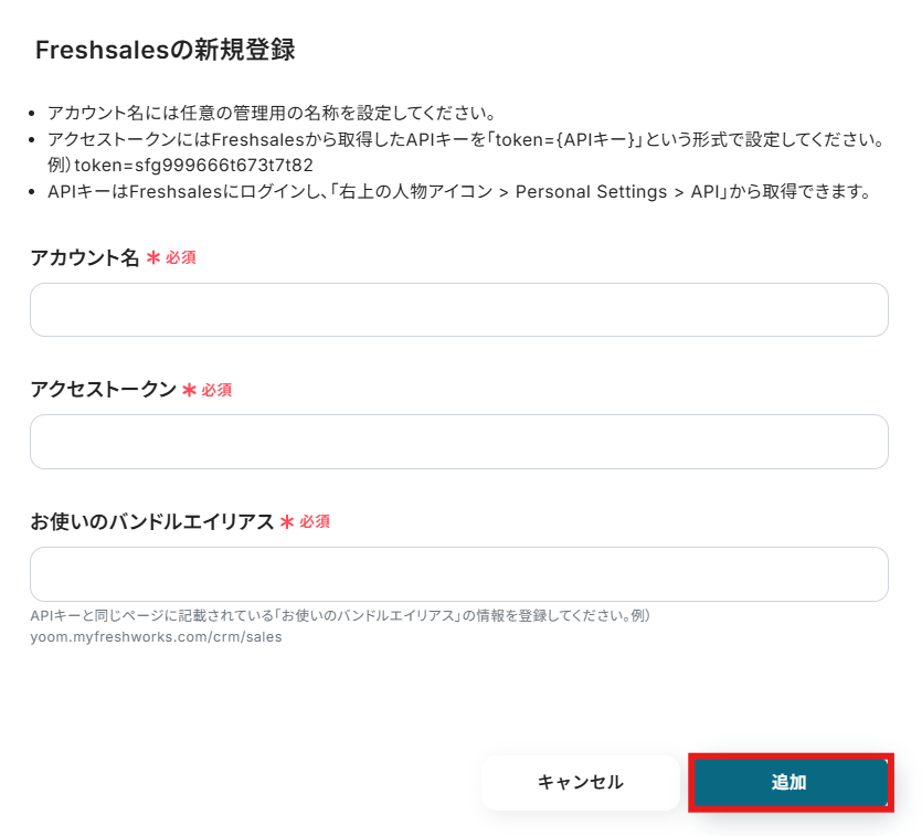 Freshsalesより、アクセストークンとバンドルエイリアスを取得し入力を行い、追加ボタンをクリックしましょう。