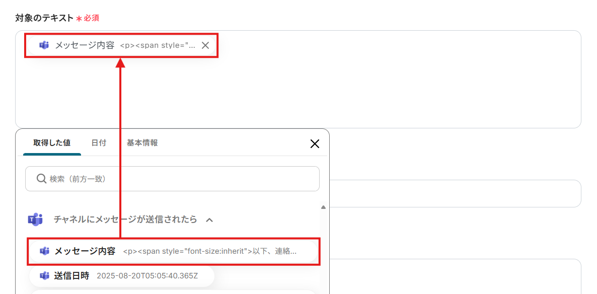 「次へ」をクリック。 「対象のテキスト」にはデフォルトで、Microsoft Teamsから取得したメッセージが設定されています。 消してしまった場合には、入力欄クリック時に表示されるトリガーアクションメニューから「メッセージ内容」を選択してください。