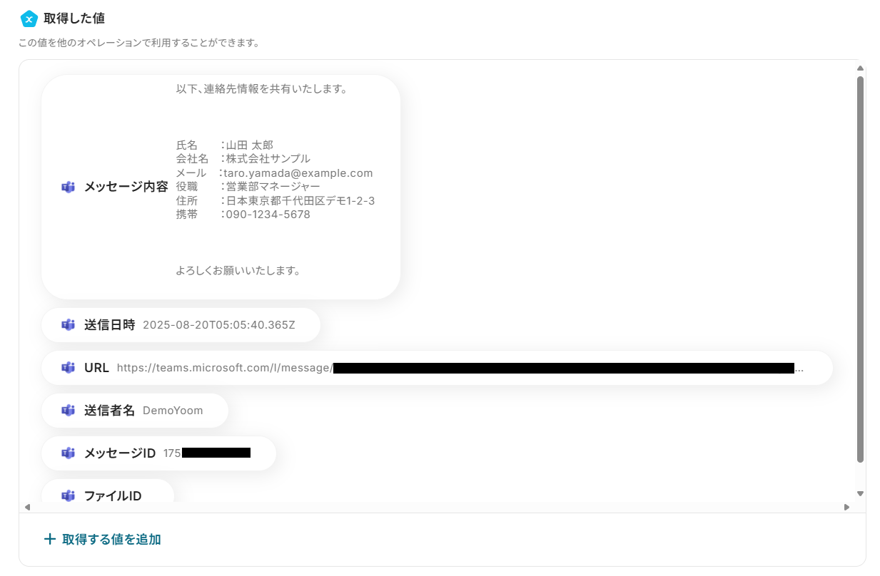 テストに成功すると、「取得した値」に投稿されたメッセージの情報が追加されます。 これらの値は、以降のアクションで変数(フローが稼働する度に更新される値 )として使用できるようになります。 詳しい説明は、こちらのヘルプページ をご覧ください。