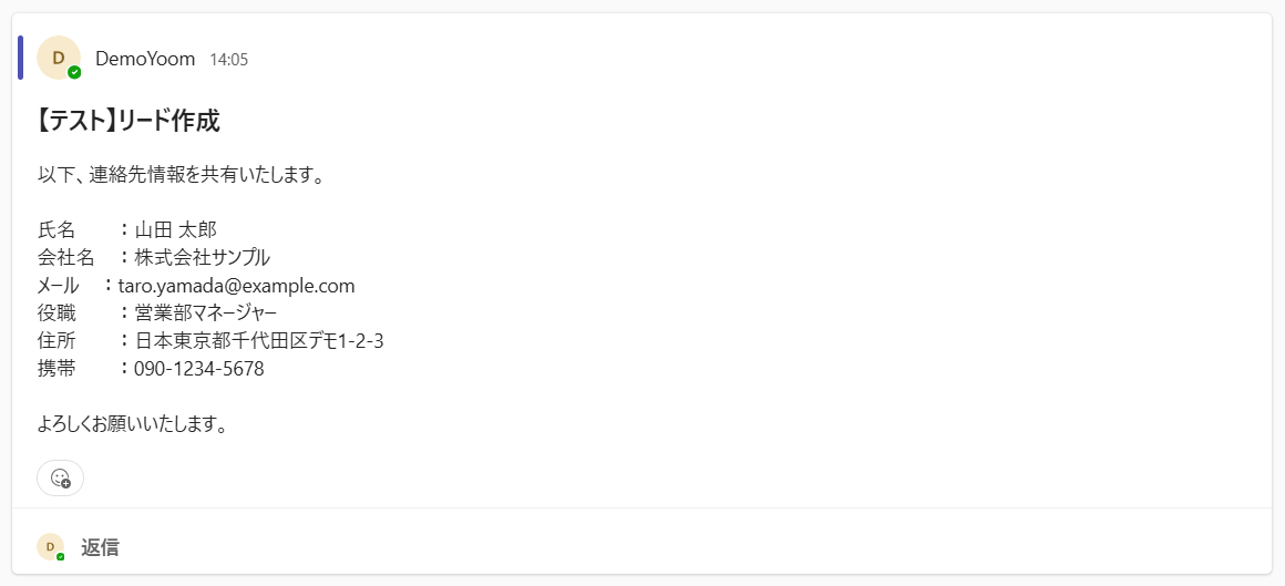 設定を終えたら、Microsoft Teamsの指定したチャネルにテスト用のメッセージを送信してください。 ※ テスト用メッセージの例