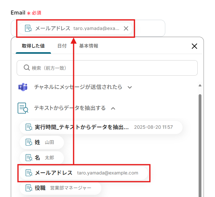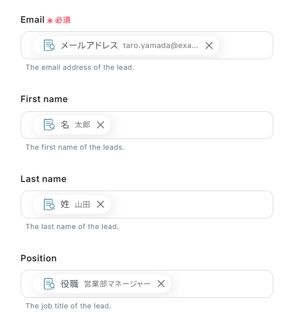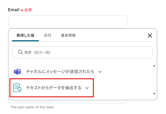 リードの各項目に沿って、これまでに取得した値を設定していきましょう。 入力欄クリック時に表示されるデータ抽出アクションのメニューから、該当する項目を選択してください。 項目をクリックすると、入力欄に{{項目名 追加された値}}という形で追加されます。