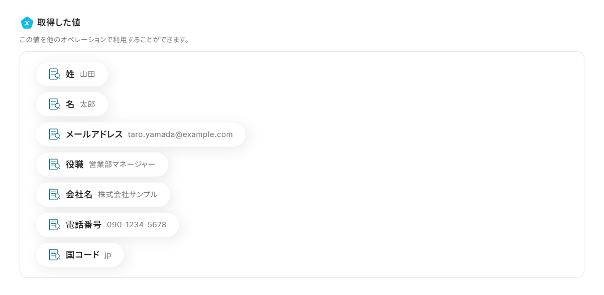 テストに成功すると、「抽出したい項目」に設定した項目が対象のテキストから抽出され、「取得した値」に追加されます。 ※ 期待する値が抽出されていない場合には、「抽出したい項目」の名称や「指示内容」を変更して再度お試しください。