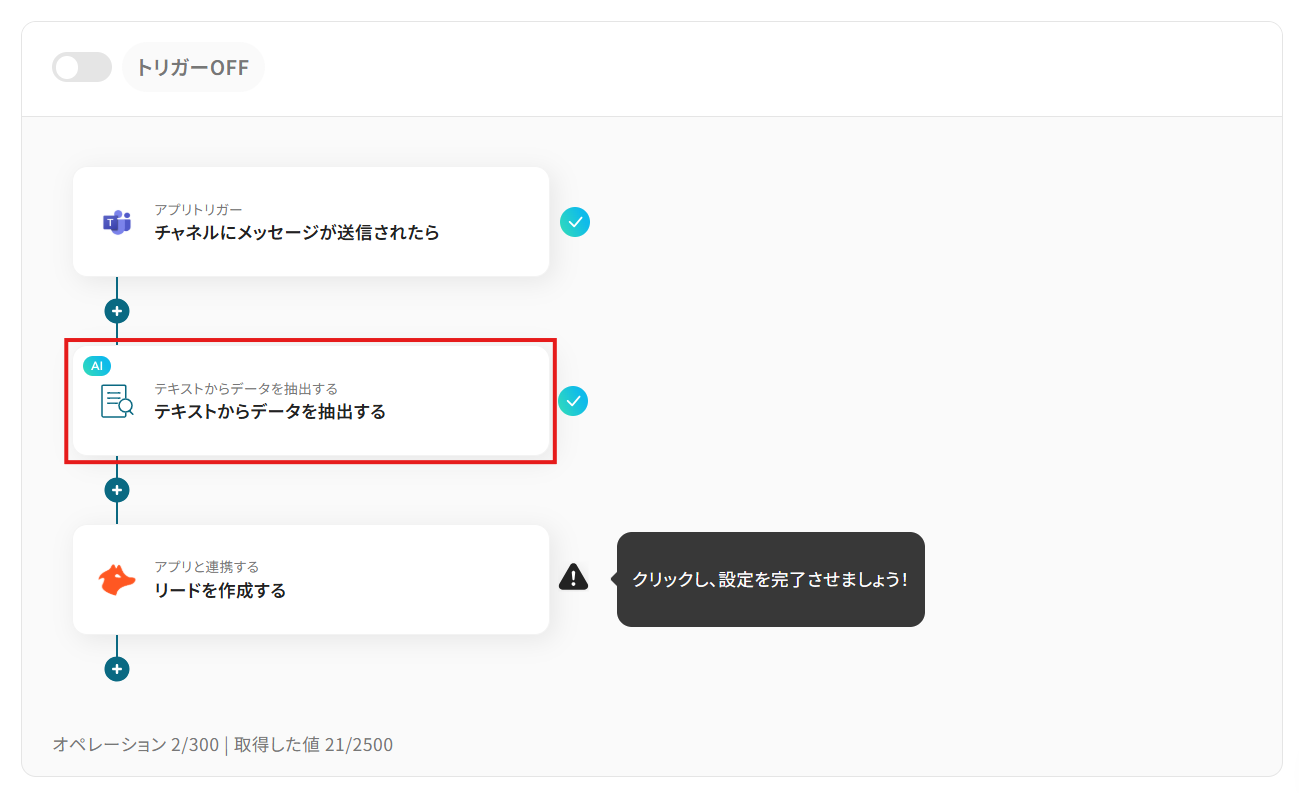 ステップ6:フロー稼働の準備 フロー画面に戻り、「全ての設定が完了しました!」と表示されていればフローの設定は完了です。 早速フローを稼働させるのであれば、「トリガーをON」をクリックします。