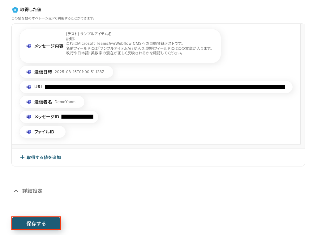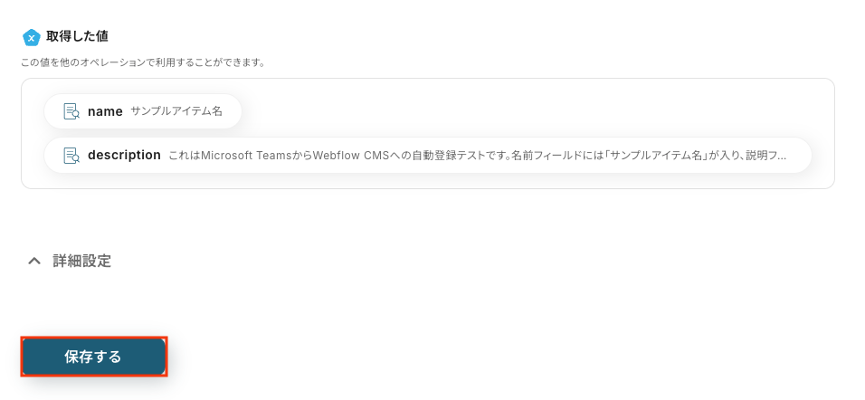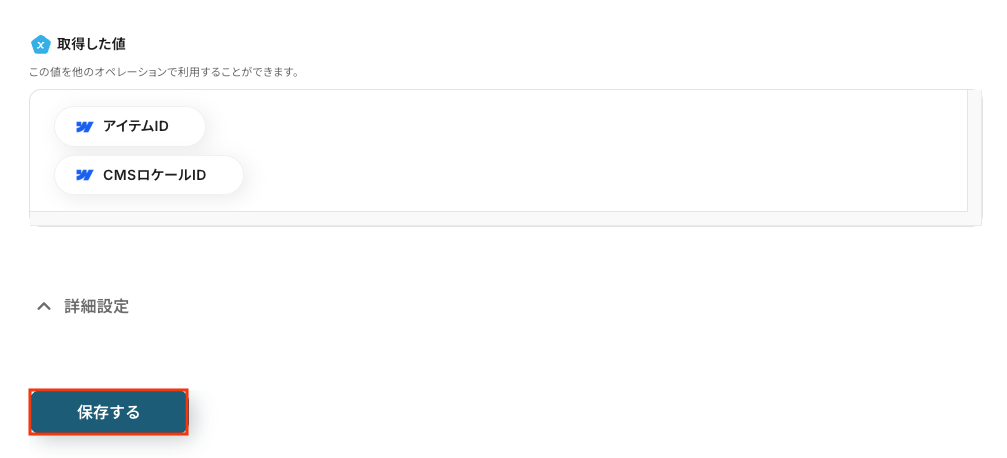 以下の画像の取得した値(=アウトプット )をもとに、後続のステップでテキストの抽出を行います。 内容を確認し、「保存する」をクリックします。