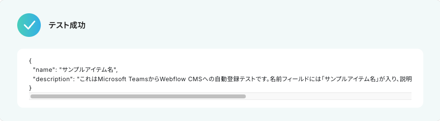 入力が完了したら「テスト」をクリックして、設定した内容でWebflowのコレクションにアイテムが追加されるか確認しましょう。