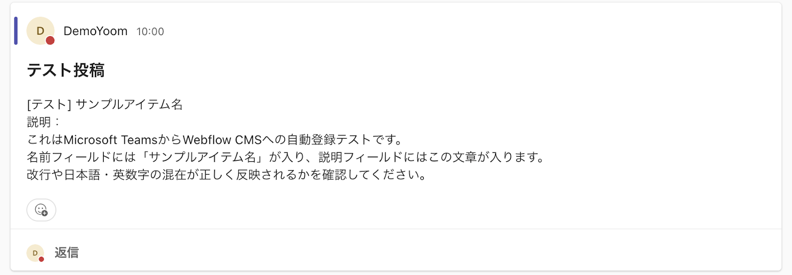 実際にMicrosoft Teamsでメッセージを送信し、Webflowにアイテムが追加されるかを確認してみましょう。