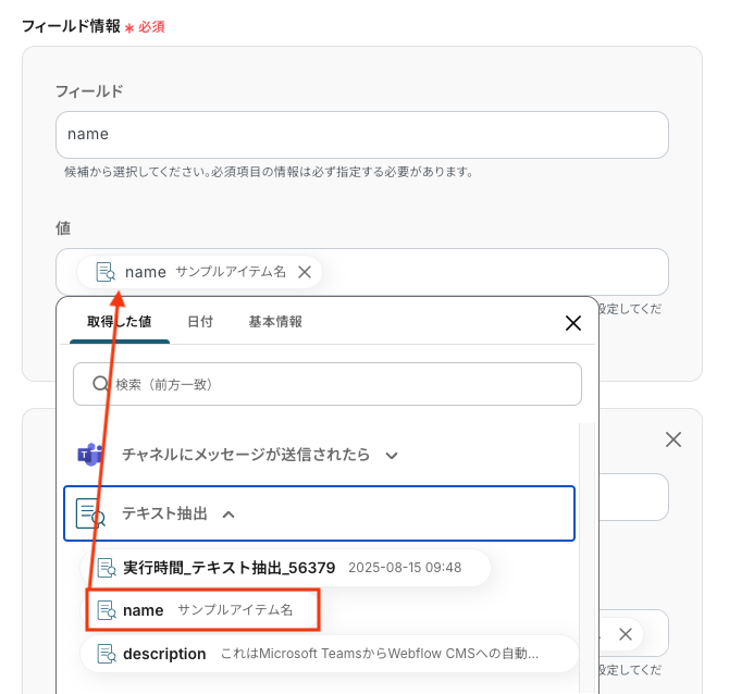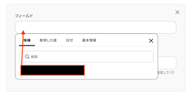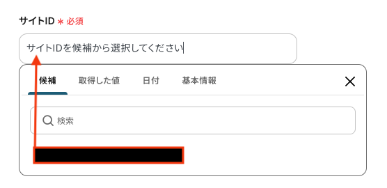 値 フィールドに登録する内容を入力します。 入力欄をクリックすると、前のステップで取得したアウトプットが表示されるので、選択して入力してください。