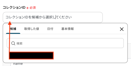 コレクションID 入力欄をクリックすると連携が有効になっているアカウントから候補が表示されるので、対象の項目を選択しましょう。