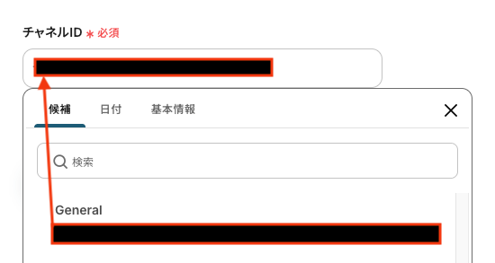 チャネルID 入力欄をクリックすると連携が有効になっているアカウントから候補が表示されるので、対象の項目を選択しましょう。