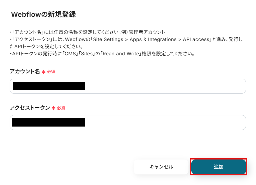 アカウント名とアクセストークンを注釈に沿って入力し、「追加」をクリックしましょう。