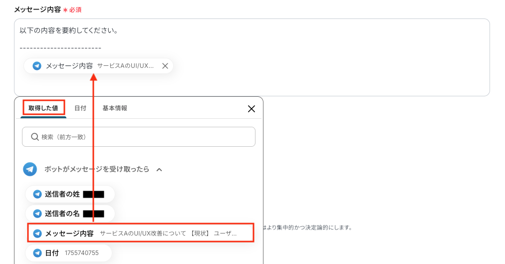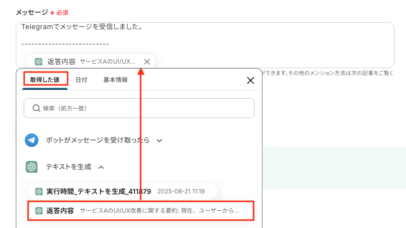 「メッセージ内容」は、取得した値から選択し、必要に応じてテキストを手動で入力してください。