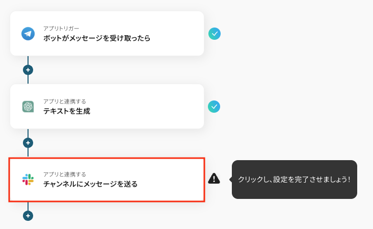 ※SlackのアプリトリガーとSlackのメッセージ送付の無限ループにならないよう分岐を設定する必要があります。(デフォルトでは「ChatGPTの回答です。」で分岐が設定されております)
