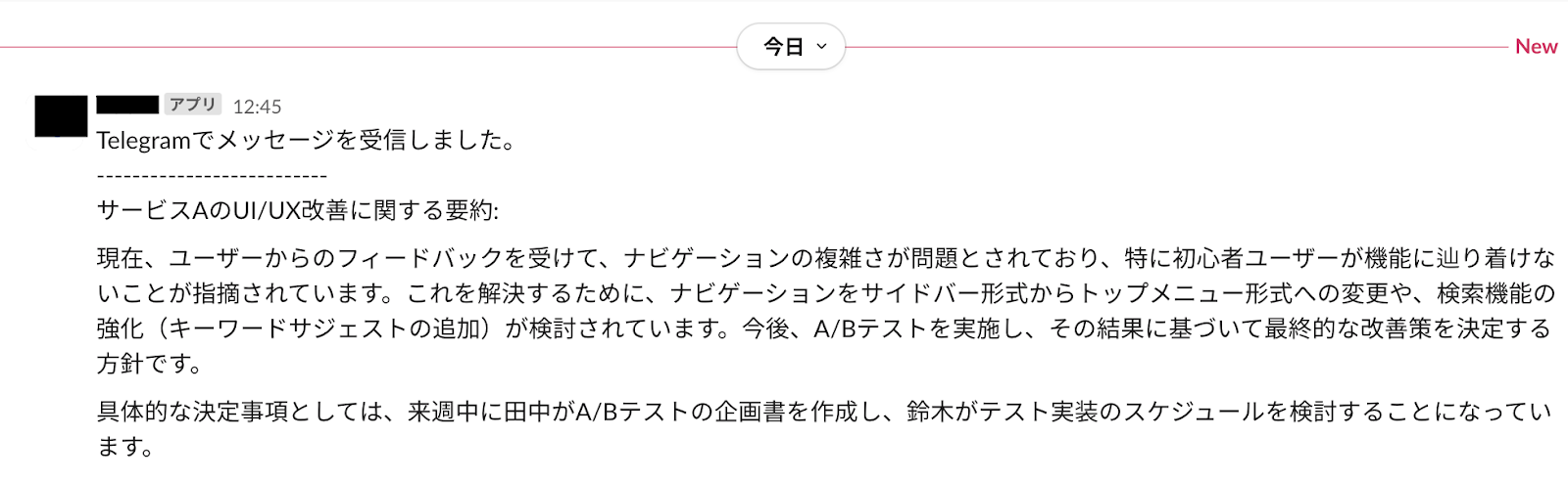 もし、Telegramに新しいメッセージが投稿されたら、その内容をAIが自動で要約し、指定のツールに通知してくれる仕組みがあれば、必要なインサイトを効率的に得られるかもしれません。