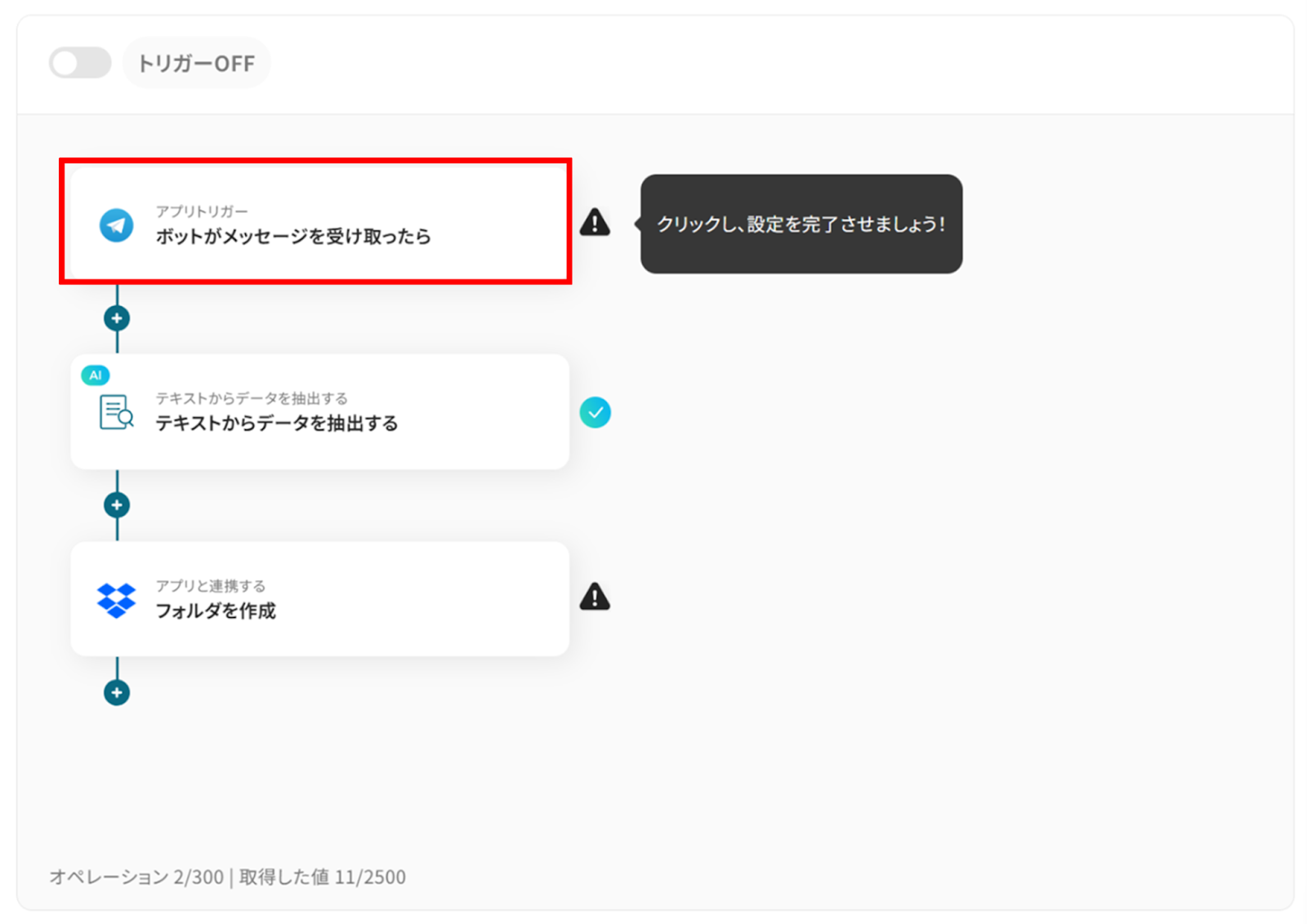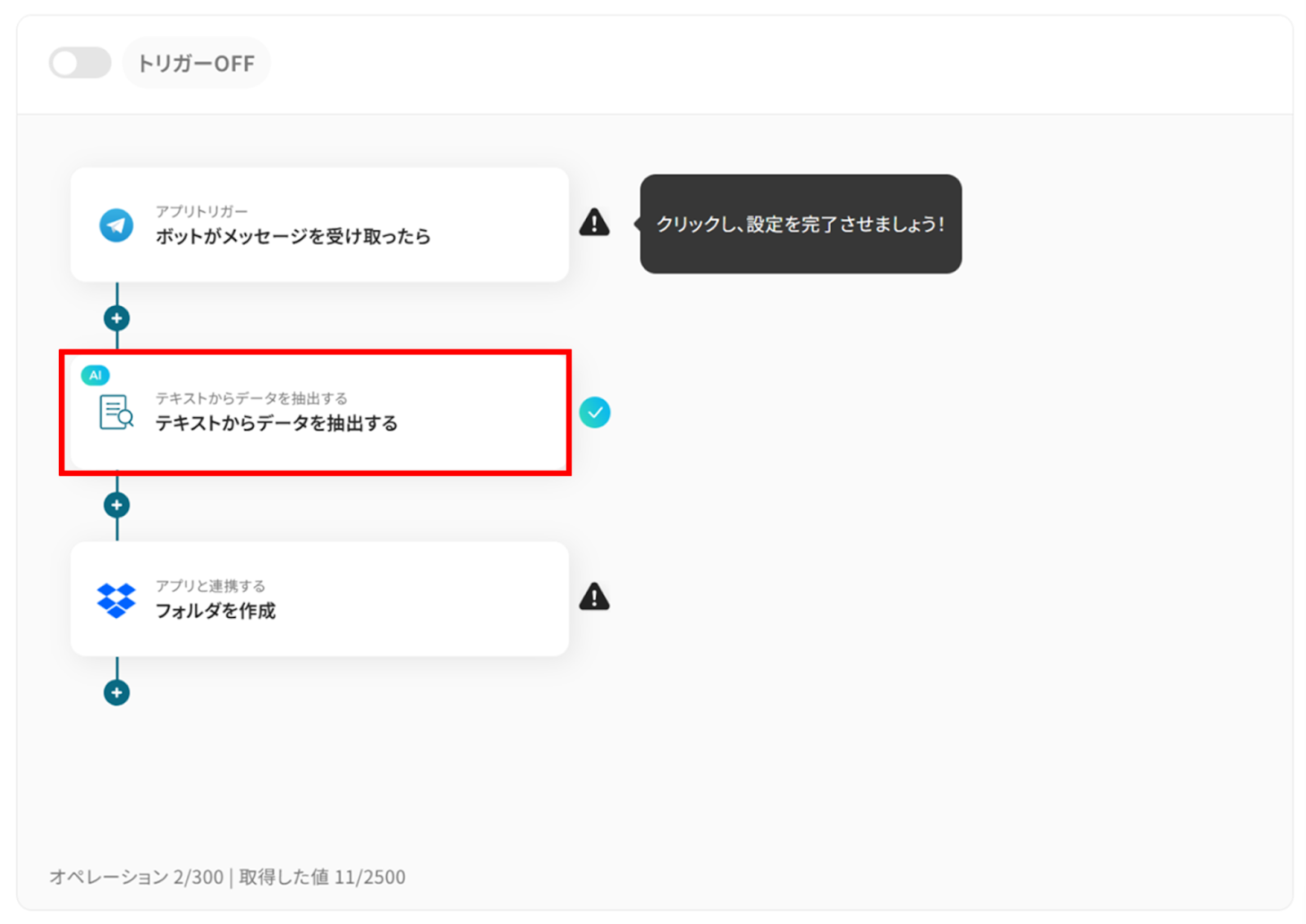 - アプリトリガー、テキストデータを抽出する、Dropboxにフォルダを作成する