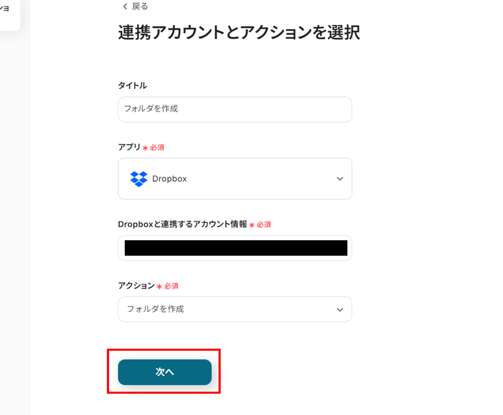 (2)「連携アカウントとアクションを選択」画面から、Dropboxと連携するアカウント情報に誤りがないかを確認し、アクションは「フォルダ作成」のままで「次へ」をクリックします。
