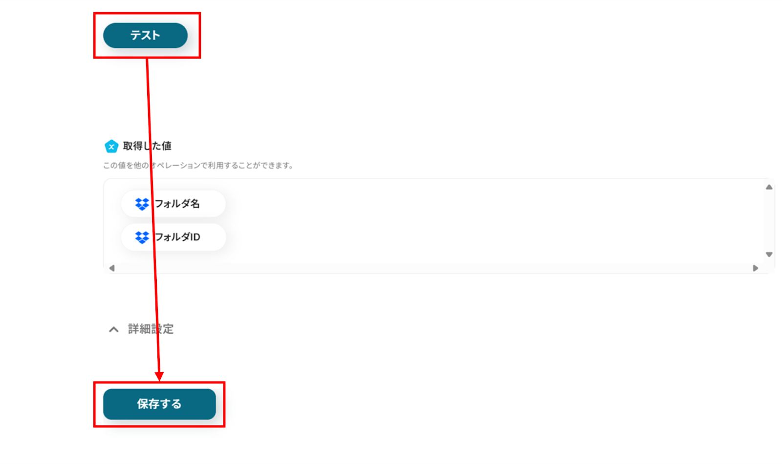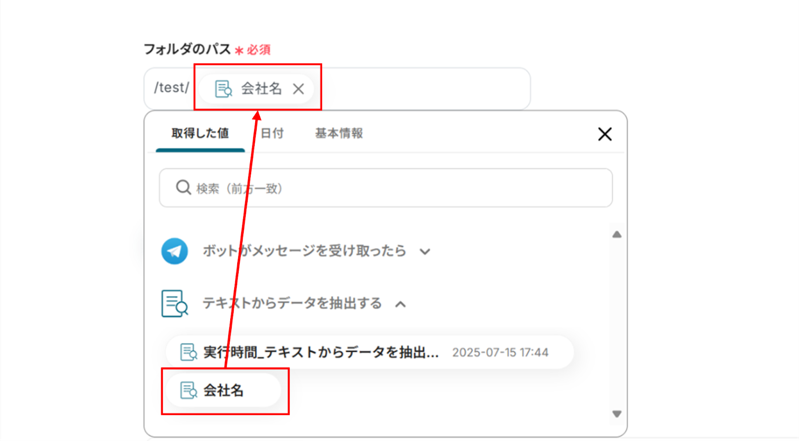 これにより、次のDropboxのアクションで抽出した会社名をフォルダのパスとして使用可能です。