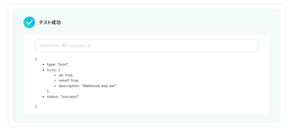 次に、アプリトリガーのAPI接続設定 です。 ここでは、Webhook(ウェブフック)の設定が正常に機能するかどうかのテストを行います。