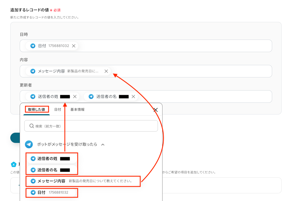 AI機能のオペレーションでは、Telegramのメッセージから「氏名」「問い合わせ内容」など、抽出したい項目や指示内容を任意で設定してください。 Google スプレッドシートにレコードを追加する際、どのシートに追加するかを選択したり、各項目に固定値や前段のトリガーやオペレーションで取得した値を埋め込むなどの設定が可能です。 ■注意事項