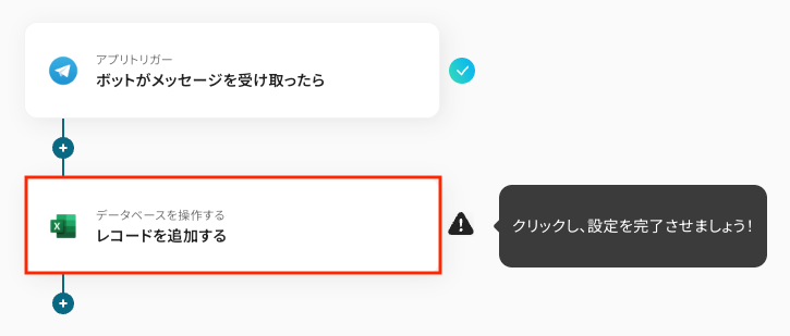 Telegramで受け取ったメッセージ内容を、Microsoft Excelに追加するための設定をします。 二つ目のオペレーションにある、「レコードを追加する」をクリックしてください。