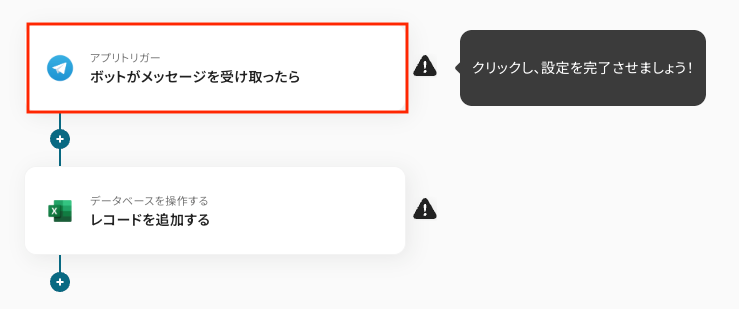 はじめに、Microsoft ExcelとTelegramをYoomと連携します 次に、トリガーでTelegramを選択し、「ボットがメッセージを受け取ったら」というアクションを設定します 最後に、オペレーションでMicrosoft Excelの「レコードを追加する」アクションを設定し、特定のシートにTelegramから受け取ったメッセージ内容が追加されるように設定します ※「トリガー」:フロー起動のきっかけとなるアクション、「オペレーション」:トリガー起動後、フロー内で処理を行うアクション