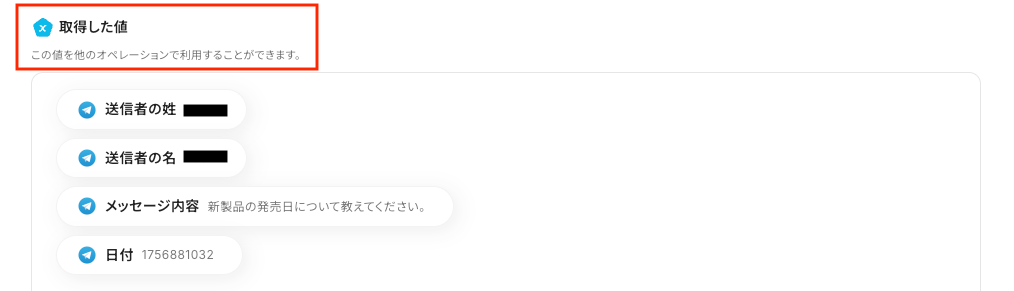 テストが成功すると、以下のように「取得した値 」が表示されます。 ※「取得した値」は、後のフローで使用します。