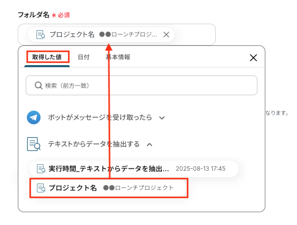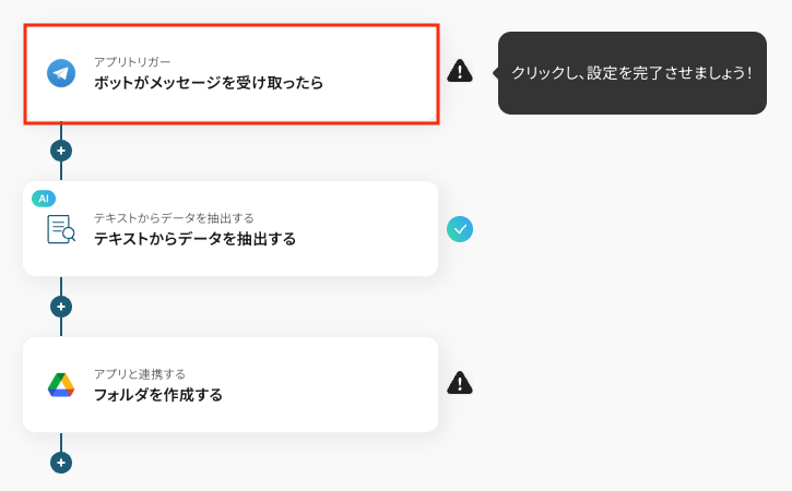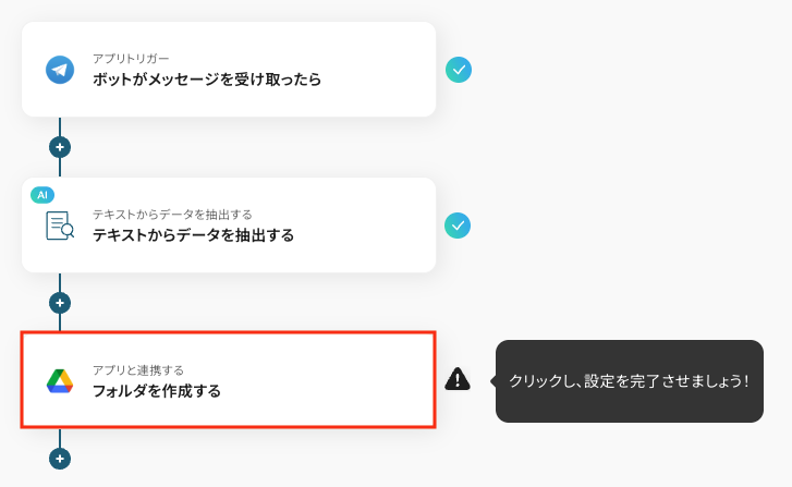 AI機能の「テキスト抽出」オペレーションで、Telegramのメッセージ本文から、どの情報をフォルダ名として抽出するかを任意で設定してください。 Google Driveでフォルダを作成するオペレーションで、どのフォルダ内に新しいフォルダを格納するか、格納先のフォルダを任意で指定してください。 ■注意事項
