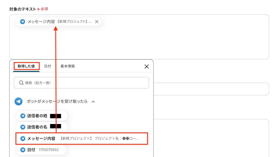 次に、詳細を設定 へ進みます。 以下を参考に、「対象のテキスト」を取得した値から選択してください。 ※取得した値を使用することで、値が固定化されずに毎回最新の情報からテキストを抽出できます。
