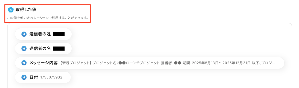 Telegramの「ボットがメッセージを受け取ったら」で取得したメッセージ本文、送信者情報、日時などの値を、後続のBox「フォルダを作成する」オペレーションで変数として埋め込むことが可能です。 ■注意事項