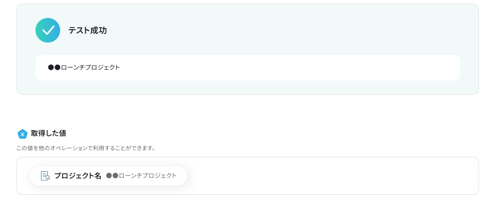 フローボットに戻り、こちらもテストします。 テストが成功すると、以下のように「取得した値 」が表示されます。 ※「取得した値」は、後のフローで使用します。