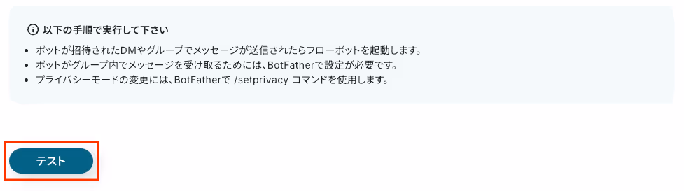 ※チャットIDを取得するには、チャットグループに作成したボットを招待し、グループ内で / 付きのメッセージ(/test など)を送信する必要があります。