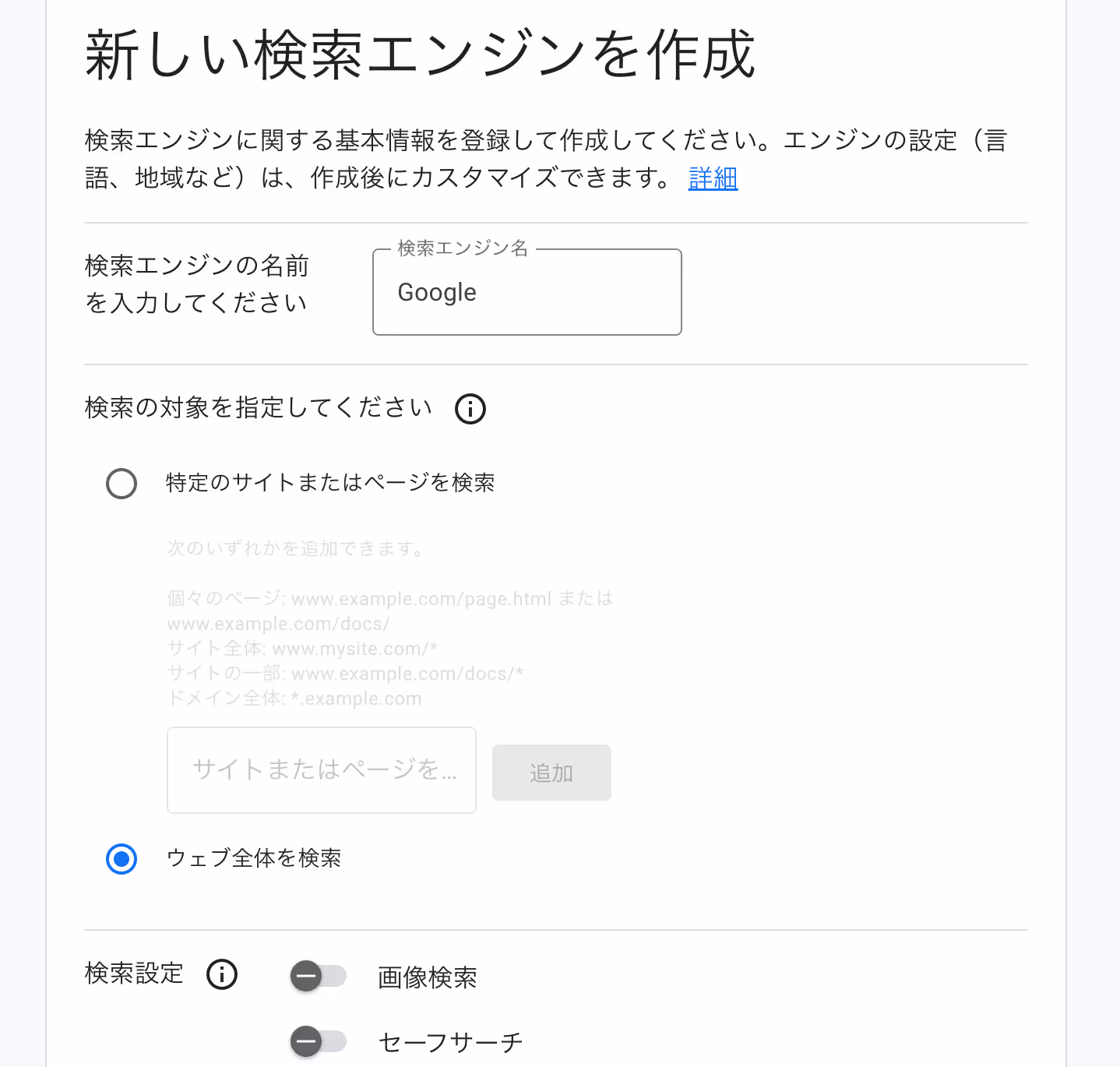 検索エンジンの作成を参考にしながら、コード(例:91c47c0667d5a4544)を取得します。