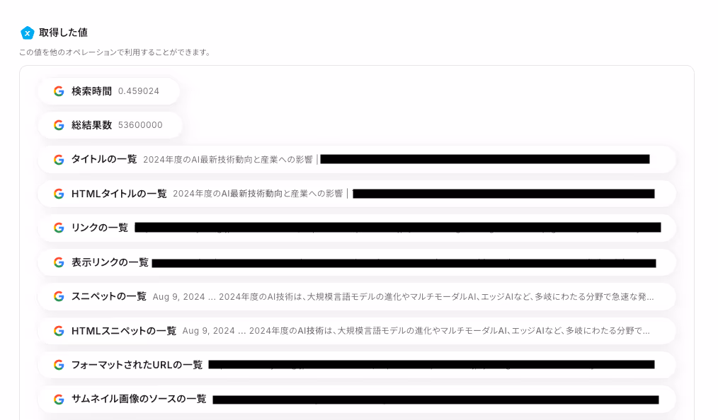 二つ目のオペレーションにある、「検索結果を取得」をクリックしてください。